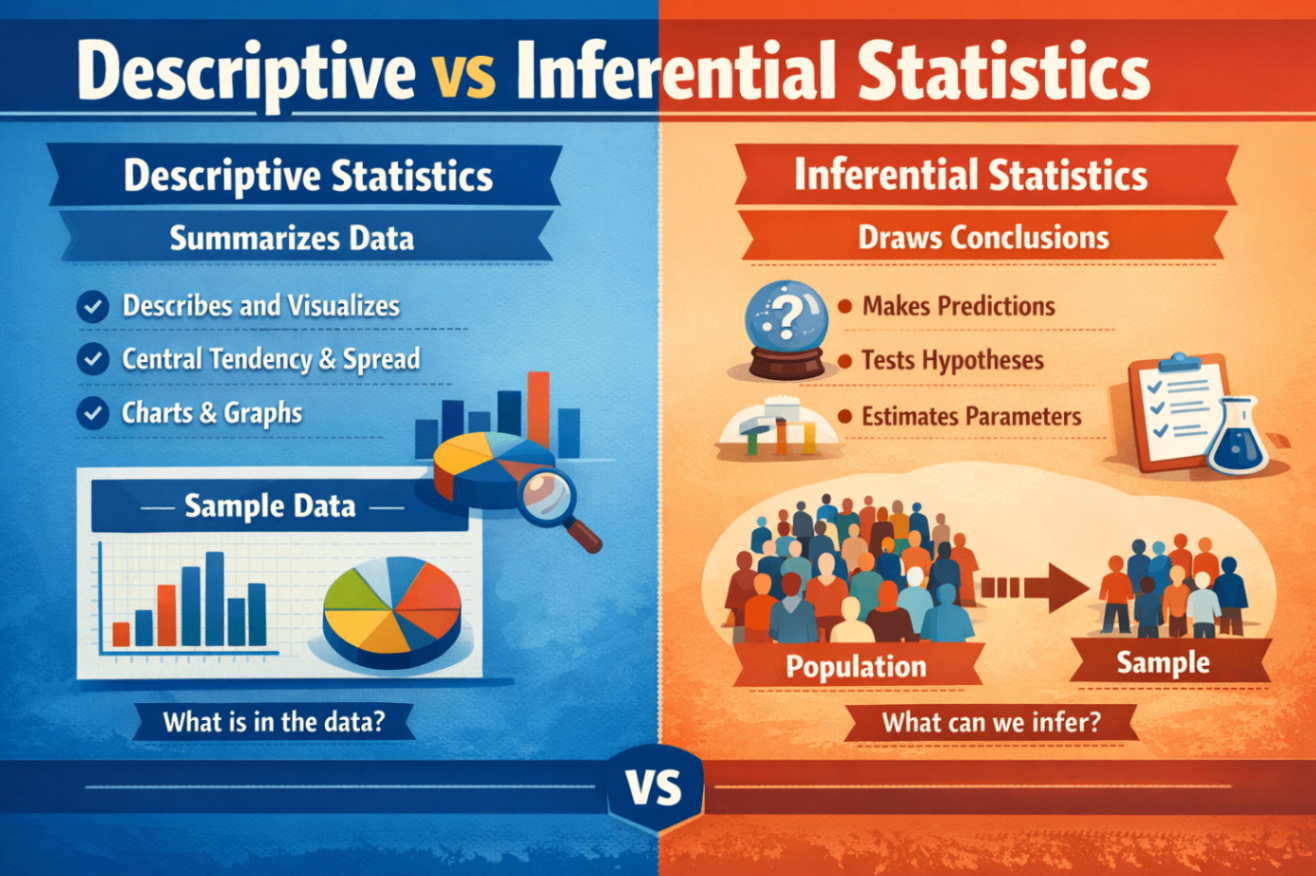 Discover descriptive vs inferential statistics differences with comprehensive definitions, real-world examples, and guidance on when to apply each statistical approach.